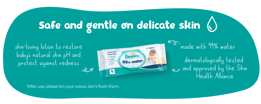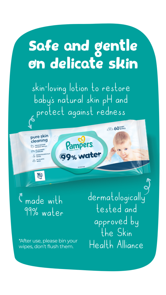Pampers 99% Water Baby Wipes are the perfect pairing for eating the rainbow! Approved by dermatologists from the Skin Health Alliance, they are safe and gentle to use to help protect babies’ delicate skin.