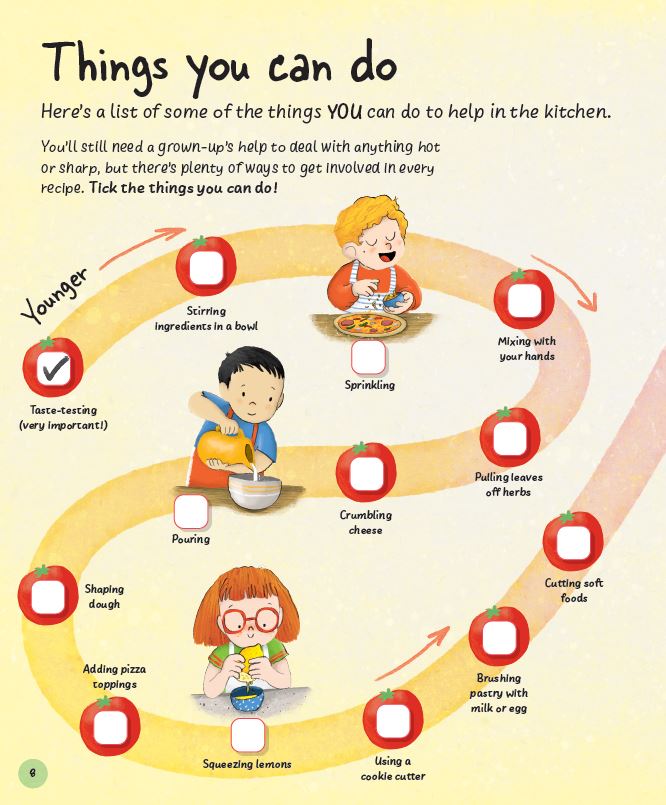 My First Cookbook is jam-packed with fun, easy-to-make recipes including Monster Pizzas, Sticky Chicken and Teddy Bear Pasta, plus lots of tempting, easy-to-make treats like Banana and Blueberry Loaf Cake and Oreo Brownies. On the way, children will get to practice all kinds of hands-on kitchen skills such as mixing, rolling, stirring, squeezing, cutting and measuring. You won’t believe how satisfying they’ll find cracking eggs and kneading dough! Each recipe is easy to follow, beautifully photographed, and features fun illustrations from Kate Greenaway Award-nominated artist Alex Willmore.